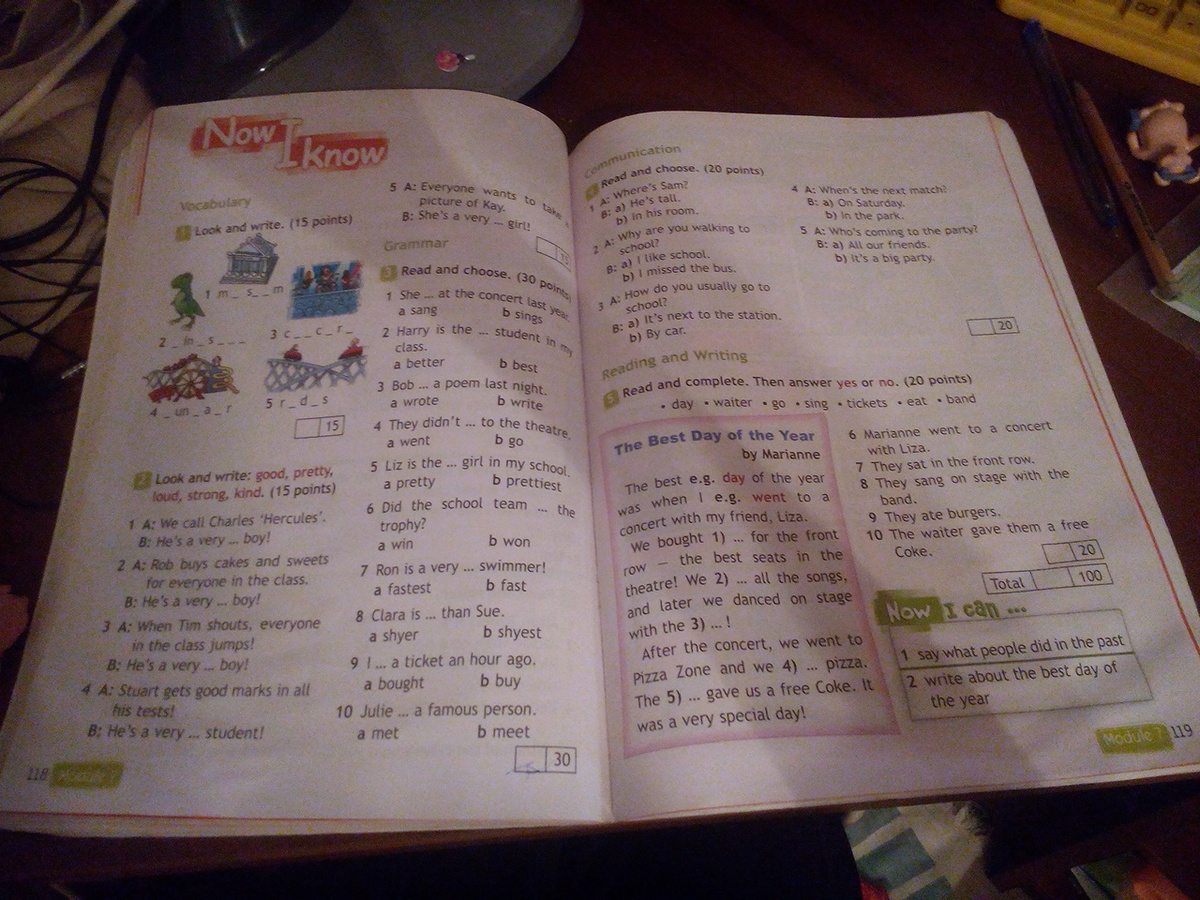 1. 1.museum 2. dinosaur 3. concert 4. funfair 5. rides. 2. 1. strong 2. kind 3. loud 4. good 5. pretty.