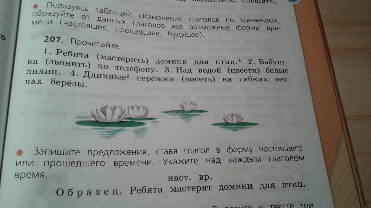 Бабушка звонит(н.вр.) по телефону.Над водой цветут(н.вр.) белые лилии.Длинные серёжки висят(н.вр.) на гибких ветках берёзы.