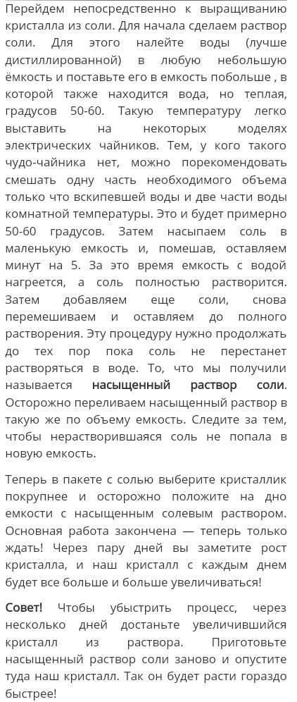 берешь банку, наливаешь воды, добавляешь как можно больше соли(но не сильно много), проволкой обматываешь ободок (или как он там называется...) банки и от него проводить проволку вверх, так, чтобы получился "крюк" на который можно привязать шерстяную нитку, привязываешь её так, чтобы другой конец находился в воде. и всю конструкцию ставишь в тёплое место (чтобы вода быстрее испарялась, а когда вода будет испаряться - на нитке будет оставаться соль, которая была в воде. и все! но может я не совсем понятно объяснил, но вроде все понятно