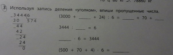 (3000 + 420 + 24) : 6 = 500 + 70 + 4
