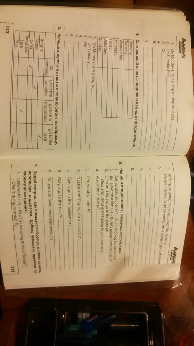 5. 2) is Vadim going to go to the lake? no, he isn't. he isn't going to go to the lake. he's going to go to the seaside; 3) is Sima going to go to the mountains? no she isn't. she isn't going to go to the mountains. she is going to go camping; 4) are Tanya and Lara going to go to the seaside? no they're not. they are not going to go to the seaside. they are going to go to the mountains; 5) am i going to go to the lake? no i'm not. i'm not going to go to the lake. i'm going to go camping
