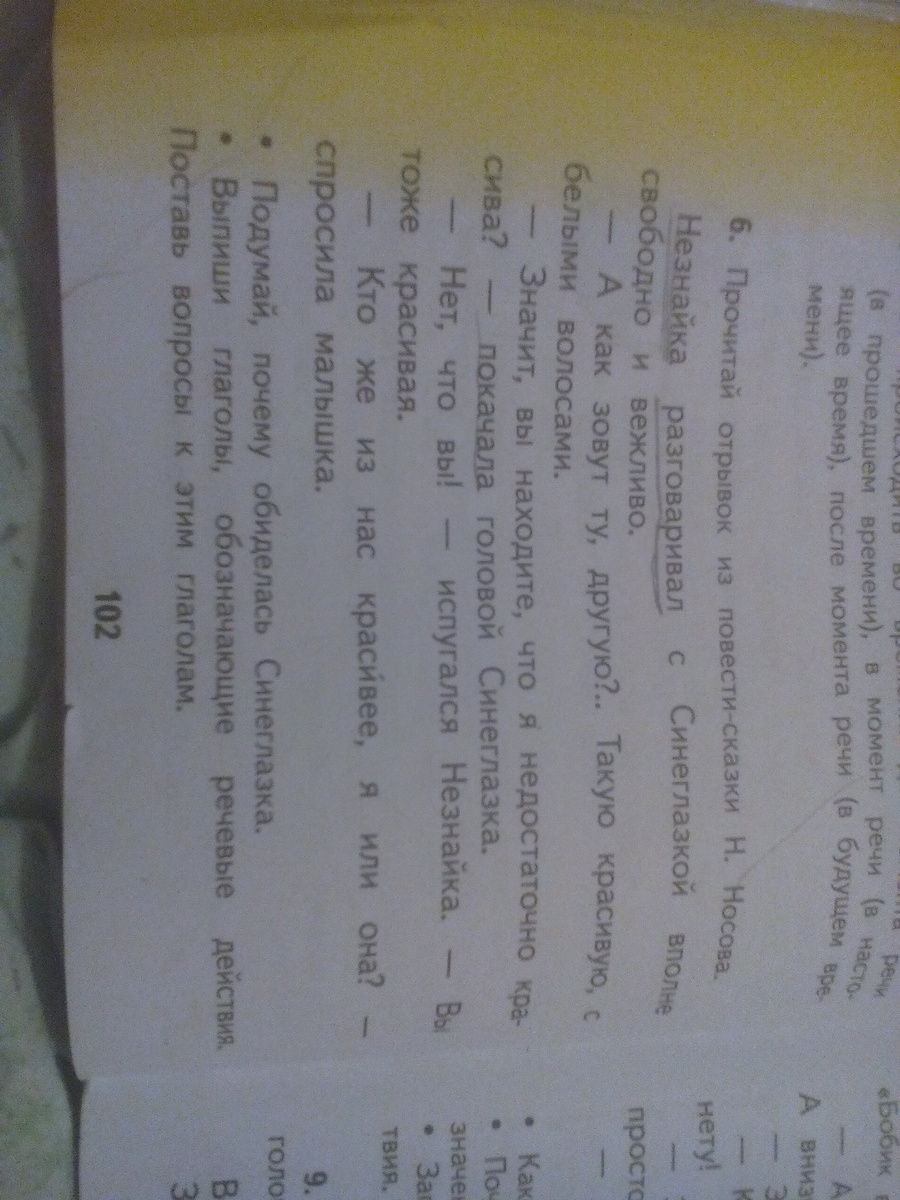На первый вопрос уж я пролмолчу. Глаголы речевого действия: разговаривал. Вопросы к нему: Разговаривал кто? Незнайка. Разговаривал с кем? С синеглазкой