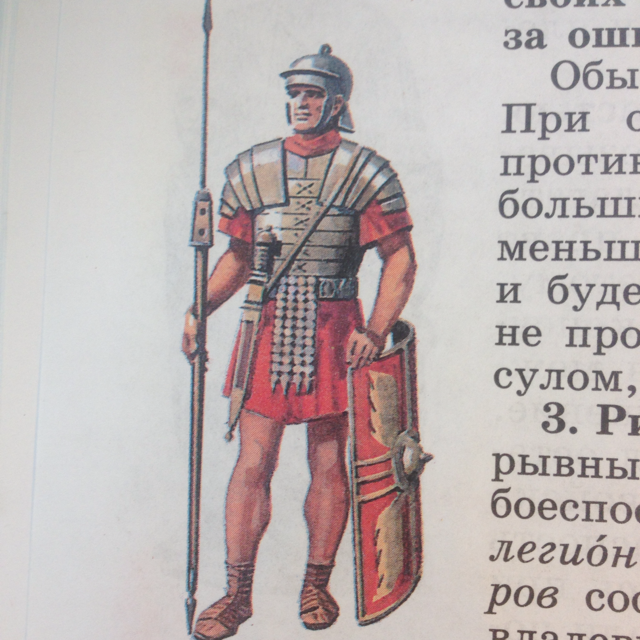 Опишите подробно чем он вооружён и как одет( но что бы учить было не сложно)