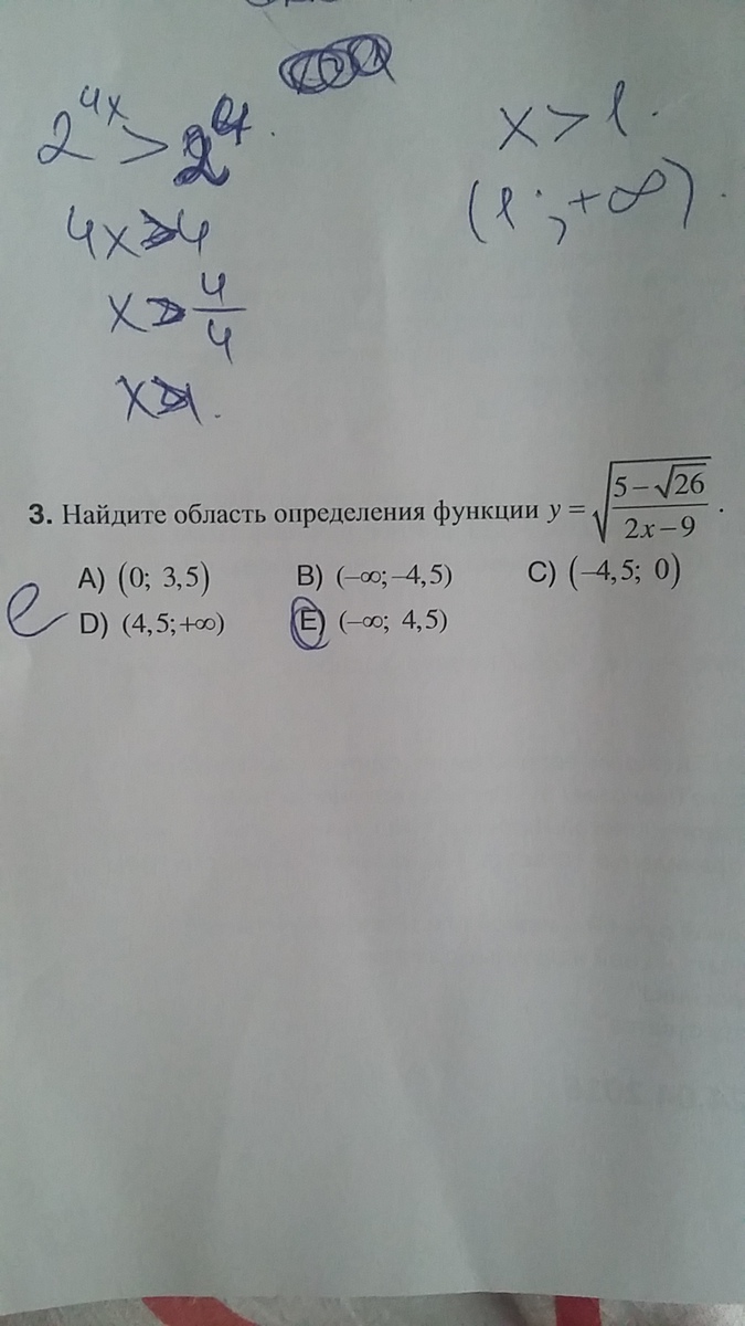 Во втором примере надо учесть несколько моментов. 1) корня квадратного из отрицательно числа не существует. В знаменателе дроби будет число отрицательное, потому что √26 больше чем 5. Значит надо чтобы и знаменатель был отрицательный (минус на минус даст плюс) 2) На ноль делить нельзя, следовательно в знаменателе дроби не должно быть нуля. Таким образом и получается что функция существует при х от минус бесконечности и до 4,5 не включительно.