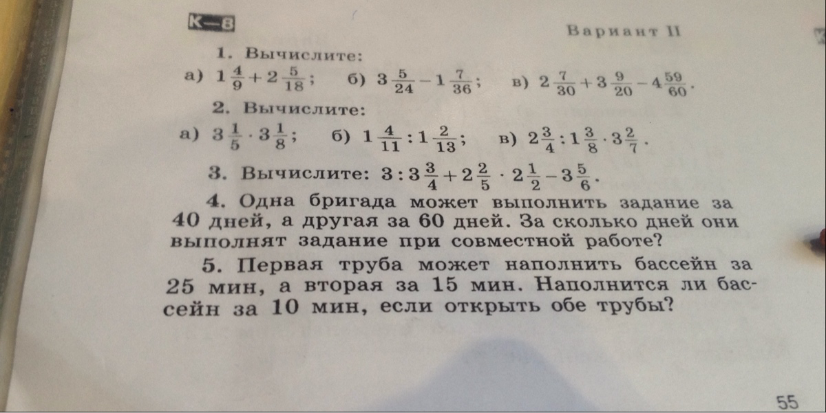 Ш 1. 5 . а . 5 7 ‘ . о на а й ‚ . там 136' 2. Вычислите ‘ 1.. 2 38, 3. Вычислите ч 4. Одна бригада может выполнить задание за 40 дней а другая за 60 дней За сколько дней они выполнят задание при совместной работе 5. Первая труба может наполнить бассейн за 25 мин в вторая за 15 мин Наполнится ли бас сей за 10 мин если открыть обе трубы 55