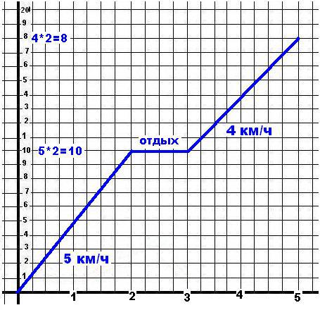 АБДУРАШИД ОТПРАВИЛСЯ В ПУТЬ В ? ЧАСОВ УТРА И ШЁЛ СО СКОРОСТЬЮ 5 КМ В ЧАС В ТЕЧЕНИЕ 2 ЧАСОВ.ЗАТЕМ ОН ОТДЫХАЛ 1 ЧАс.ПОСЛЕ ЭТОГО ОН ШЁЛ СО СКОРОСТЬЮ 4 км В ЧАС СНОВА В ТЕЧЕНИЕ 2 ЧАСОВ,ПОКА НЕ ПРИШЕЛ ПО АДРЕСУ НАЧЕРТИТЕ ГРАФИК ДВИЖЕНИЯ