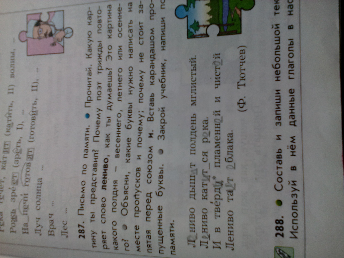 Я представляю весенний лес. Я думаю что поэт трижды повторяет слово лениво потому, что весной только только оттаила река, медленно продвигается день и медленно летят облака. Это картина весеннего полдня.