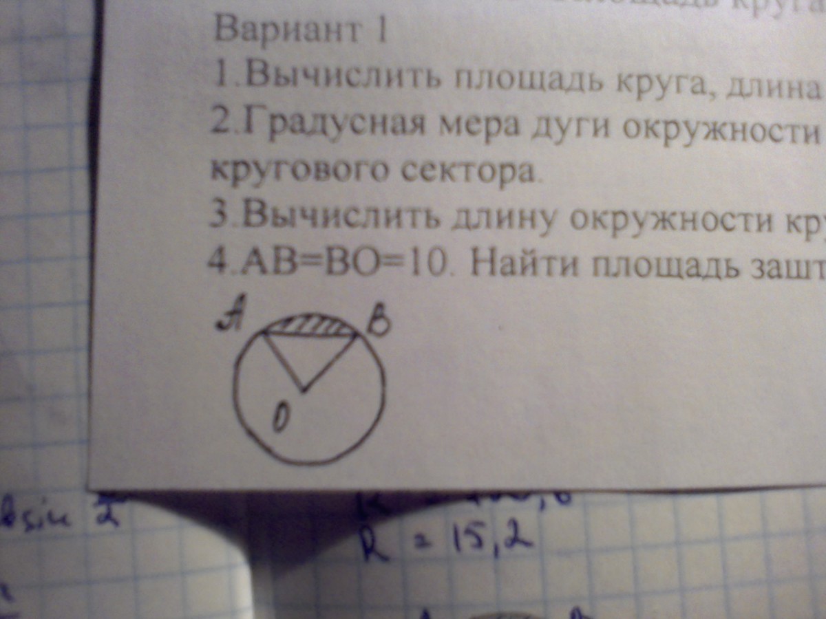 АВ=ВО=10. Найти площадь заштрихованной фигуры на рисунке. Помогите, пожалуйста, заранее огромное спасибо :3