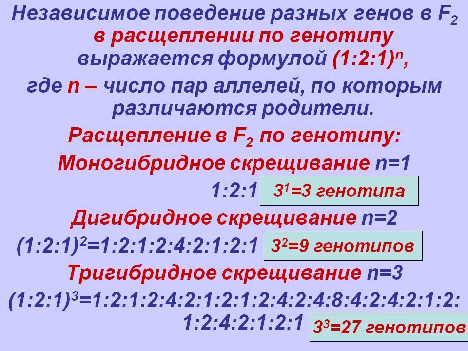 Вспомните,сколько генотипов в F2 при моногибридном,дигибридном скрещиваниях.Сколько генотипов будет в F2 при тригибридном скрещивании?Попробуйте вывести общую формулу числа генотипов в F2 для полигибридного скрещивании.