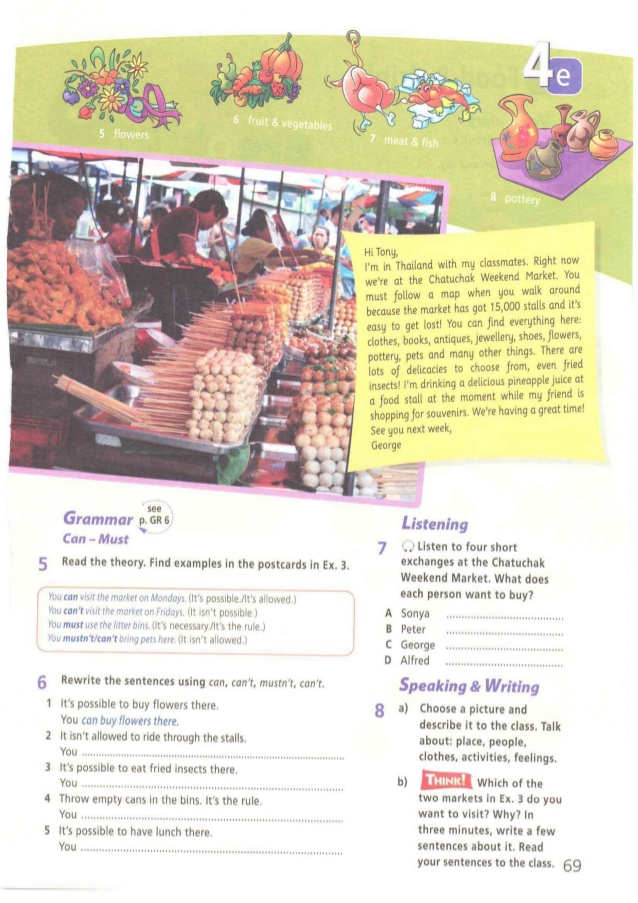 Привет, Тони, я в Тайланде со своими одноклассниками. Сейчас мы на выходном рынке Чатучак. Ты обязательно должен следовать карте, когда ты прогуливаешься, потому что на рынке 15000 киосков и можно очень легко потеряться! Ты можешь найти здесь все: одежду, книги, антиквариат, бижутерию, обувь, цветы, глиняные изделия, животных и многие другие вещи. Тут есть множество деликатесов, из которых есть что выбрать, даже жареные насекомые! Я пью вкусный ананасовый сок в ларьке с едой в момент, когда мои друзья покупают сувениры. Мы отлично проводим время! Увидимся на следующей неделе, Джордж!