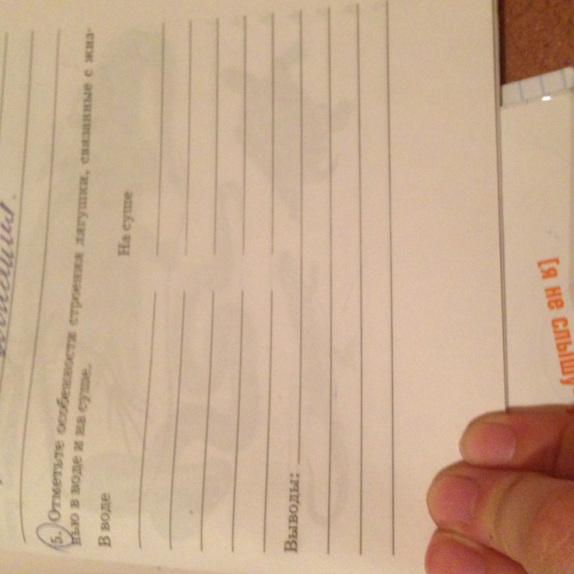 Лягушка часто мигает, при этом влажная кожа век смачивает поверхность глаз, предохраняя их от высыхания. Эта особенность развилась у лягушки в связи с ее наземным образом жизни . Рыбы, глаза которых постоянно находятся в воде , век не имеют. Впереди глаз на голове заметна пара ноздрей. Это не только отверстия органов обоняния. Лягушка дышит атмосферным воздухом, который попадает в ее организм через ноздри. Глаза и ноздри расположены на верхней стороне головы. Когда лягушка прячется в воду , она выставляет их наружу. При этом она может дышать атмосферным воздухом и видеть то, что происходит вне воды . Позади каждого глаза па голове лягушки заметен небольшой кружок, затянутый кожей. Это наружная часть органа слуха - барабанная перепонка. Внутреннее ухо лягушки , так же как и у рыб, помещается в костях черепной коробки.