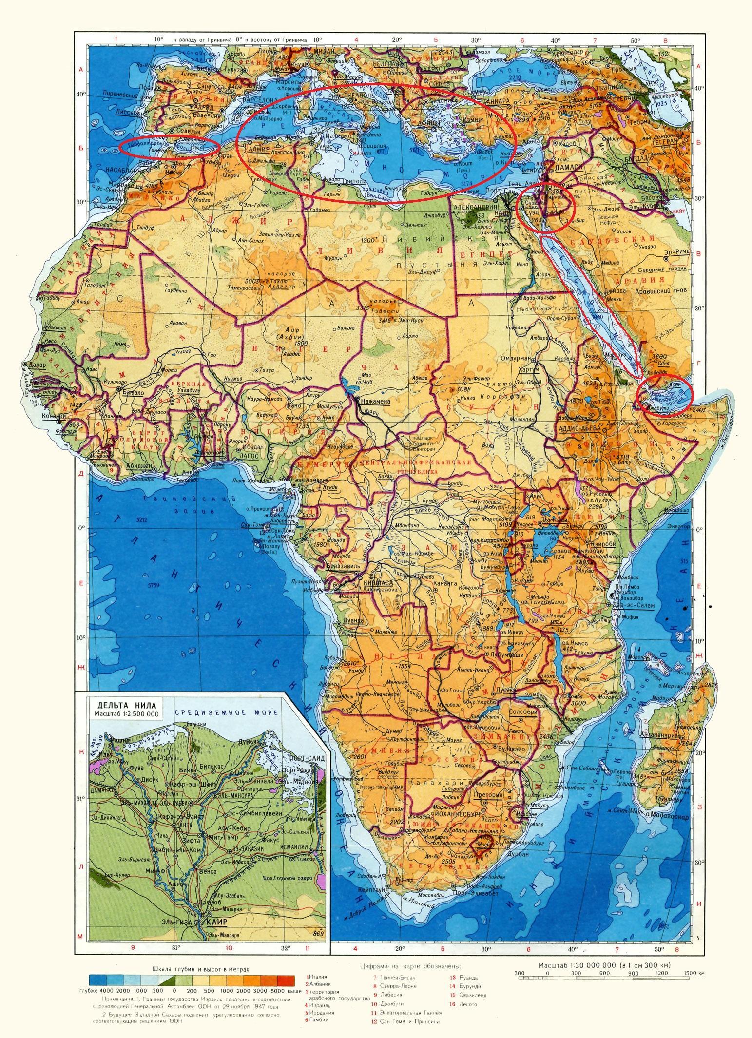Африку от Азии отделяет Красное море, Суэцкий канал, Баб-эль-Мандебский пролив.