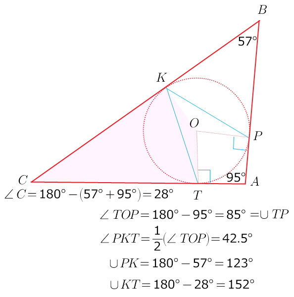 _даю 80б_Окружность с центром O касается сторон AB,BC,CA треугольника ABC в точках P K T соответственно. Найдите дугу PK дугу KT дугу TP и угол PKT,если угол