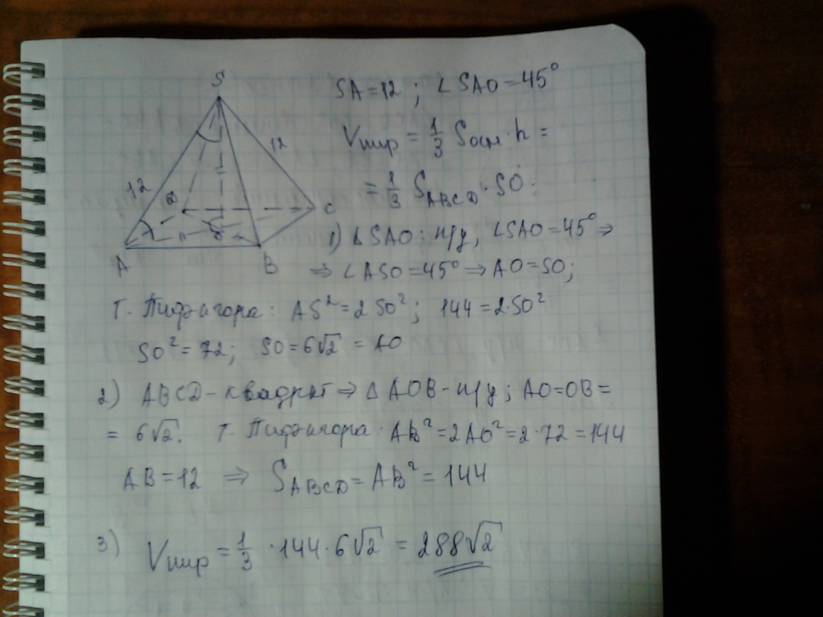 Найдите объем правильной четырехугольной пирамиды, боковое ребро которой равно 12 см и образует с плоскостью основания угол 45 °.