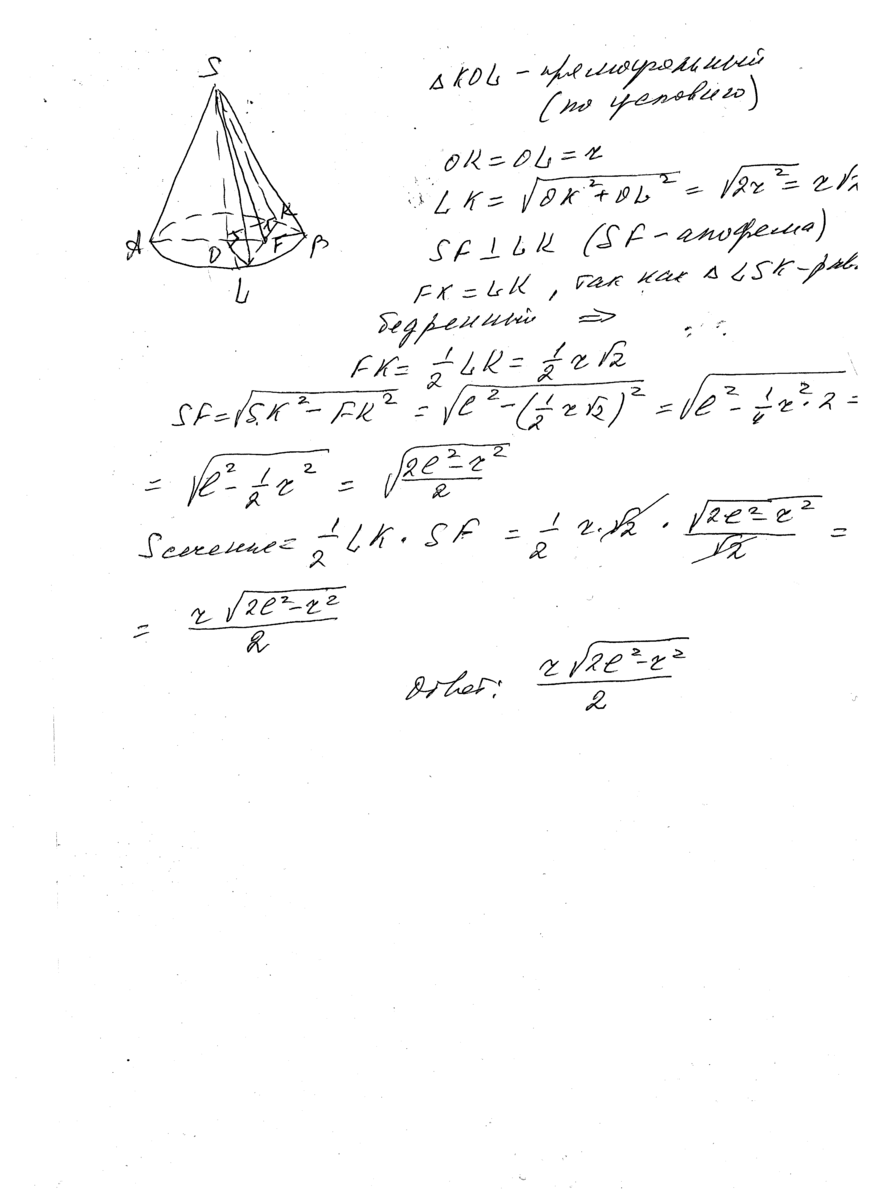 Образующая конуса равна l, а радиус основания равен r. Найдите площадь сечения, проходящего через вершину конуса и ходу основания, стягивает дугу в 90 градусов.