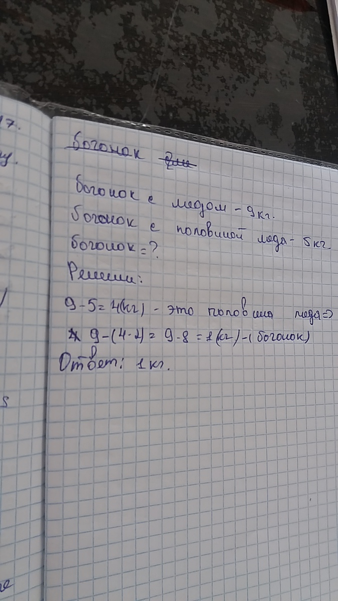 1) 9-5=4(кг) половину меда съели