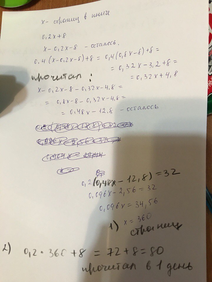 В первый день ученик прочитал 20% числа страниц книги и ещё 8 страниц. Во второй день 40% оставшихся страниц книги и ещё 8 страниц . Когда в третий день он прочитал 20% оставшегося количества страниц, то ему осталось прочитать ещё 32 страницы.