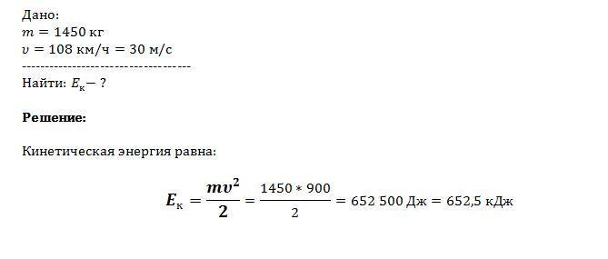 Найдите кинетическую энергию автомобиля «Волга» (ГАЗ-24) массой 1450 кг, движущегося со скоростью 108 км/ч.