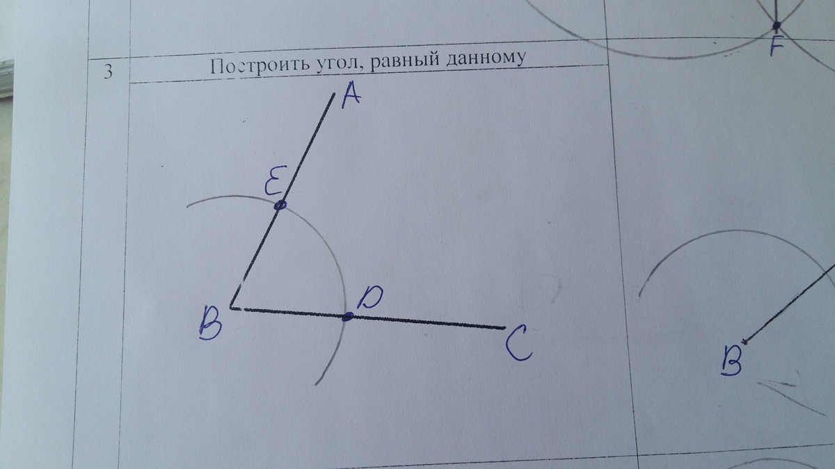 1.проведем произвольную с центром в точке А 2.точка пересечения окружности е и д обозначим Е и Д 3.возьмем и произвольный луч а в точке О 4.проведем окружность с центром О и радиусом АДω(О;AD) 5.проведемω(O;AE) 6.ω(O;OD)∩ω(O;AE)=E DBE=искомый