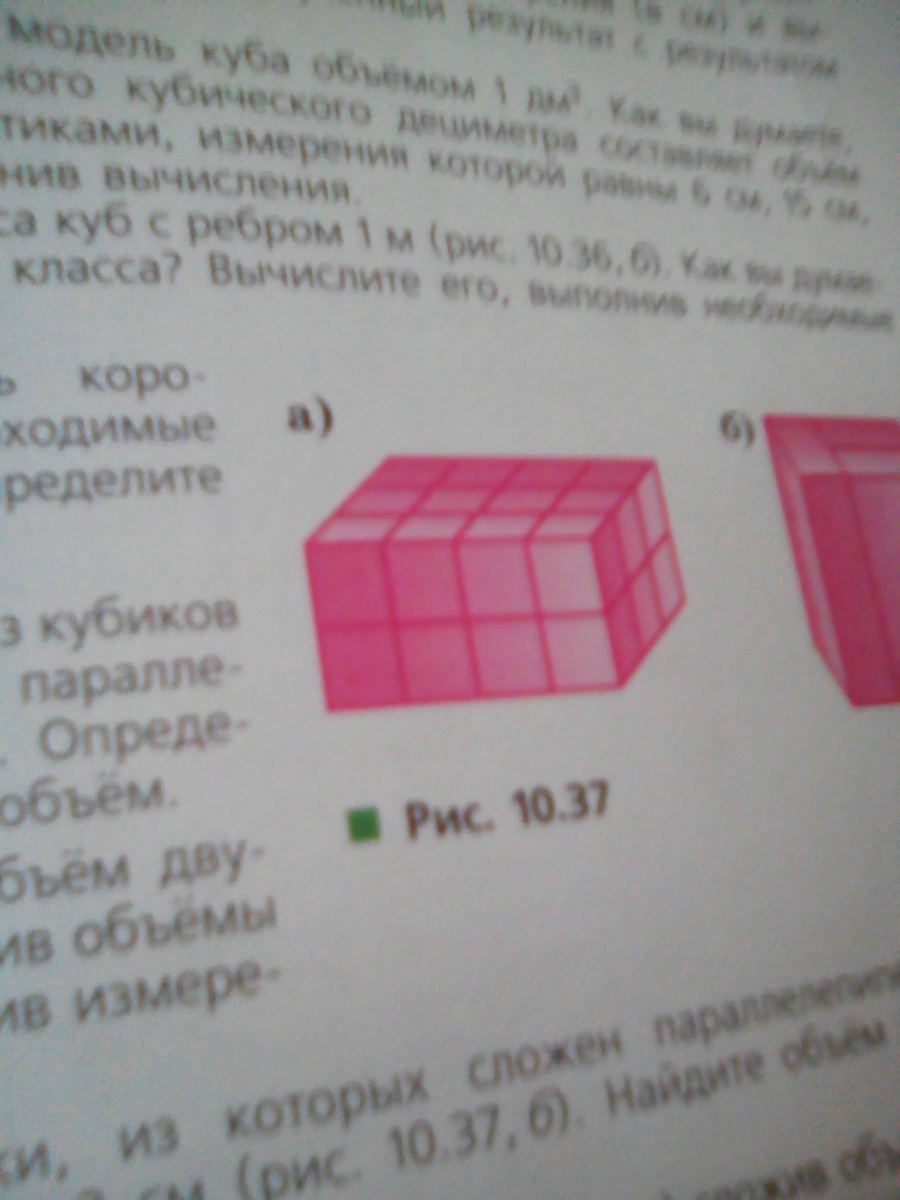Из ккубиков с ребром 5 ,см сложили паралелепипед (рис 10. 37'а). определите его измерения и объем. Вычислите объем двумя способами а) сложив объемы кубиков. б) перемножив измерения паралепипеда.
