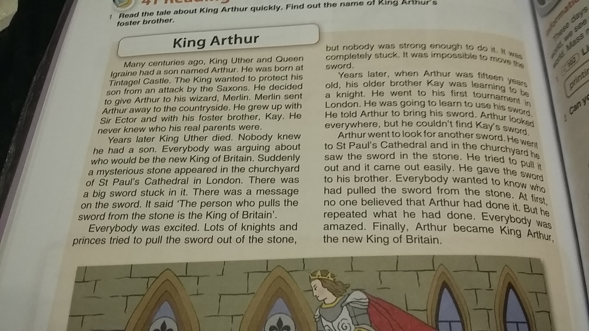 Несколько лет спустя король Утер умер. Никто не знал,что у него был сын. Все спорили о том,кто будет новым королем Англии. Вдруг таинственный камень появился в ограде собора Святого Павла в Лондон. Был большой меч застрявший в нем. Он сказал:Человек,который вытащит меч из камня, станет королем Британии"все были возбуждены. Много рыцарей,князей пытались вытащить меч из камня