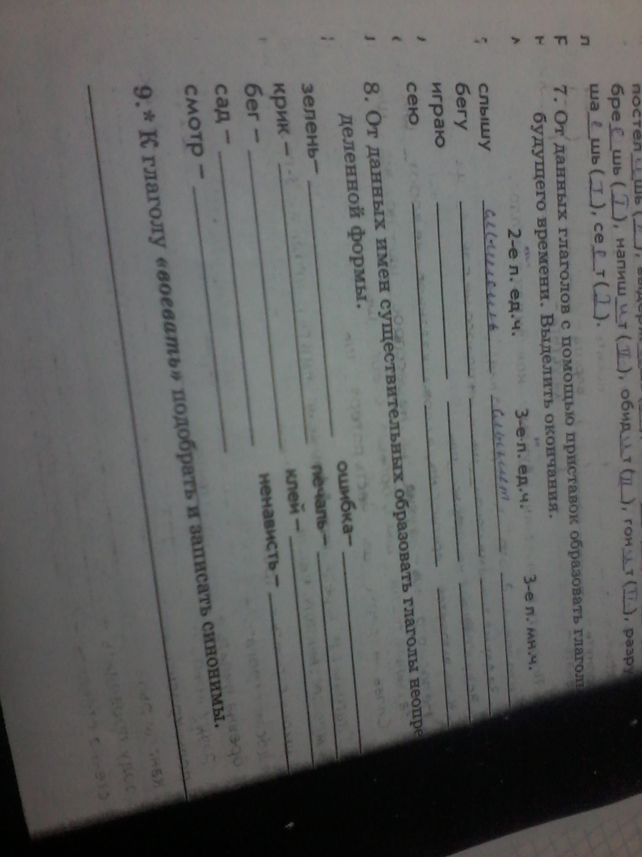 8.Зелень - зеленеть, крик - кричать, бег - бегать, сад - садить, смотр - смотреть, ошибка - ошибиться, печаль - печалиться, клей - клеить, ненависть - ненавидеть.