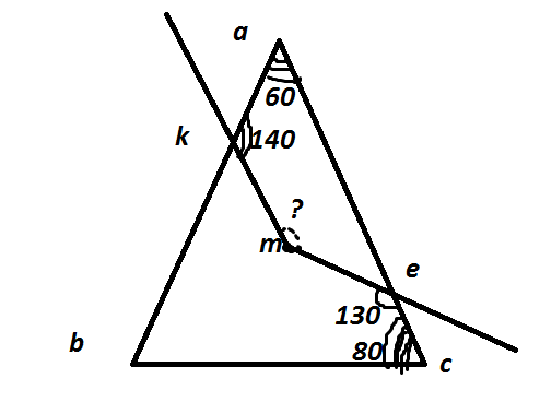 Внутри треугольника ABC взята точка M через которую проведены прямые, пересекающие стороны АВ и ВС в точке К и Е. Угол МКА=140, угол МЕС=130, угол А=60, угол С=80. Найти угол КМЕ.