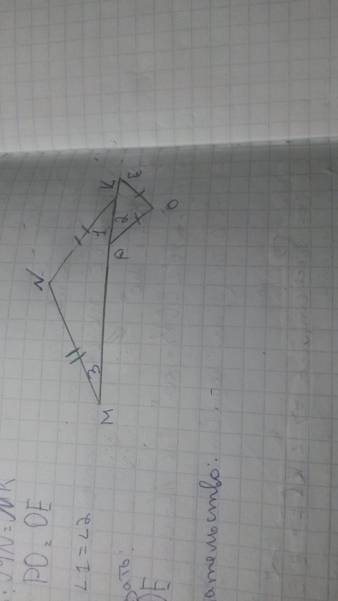 Треугольники MNK и ОЕР равнобедренные, значит углы при их основаниях равны. Итак, <NMK=<1, а <PEO=<2.