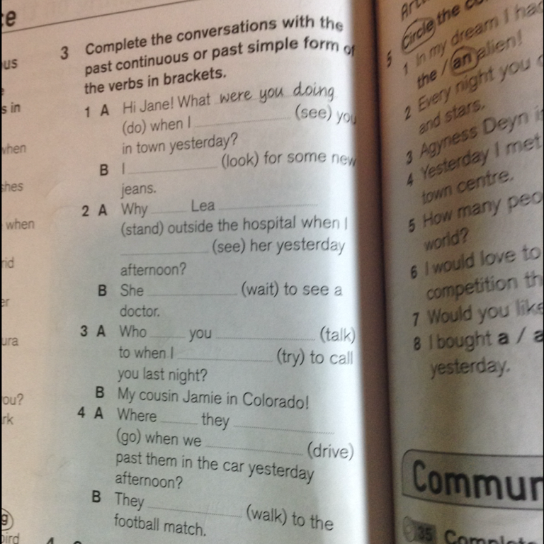 2. A) was standing when i saw...B) was waiting3. A)Who were you talking to when tried4. A) Where did the go when we were driving...B) were walking
