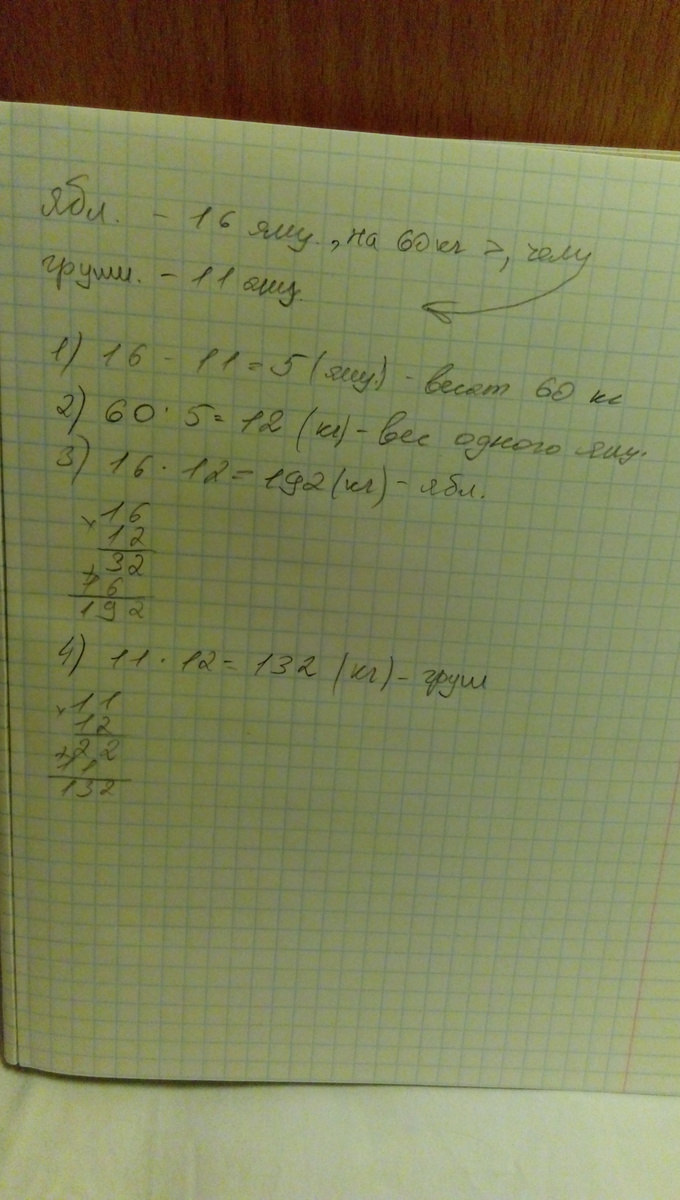 В школу привезли одинаковые по массе ящики с яблоками и грушами.Ящиков с яблоками было16, с грушами11.яблок привезли на60кг больше чем груш сколько кг груш привезли в школу?сколько кг яблок привезли в школу