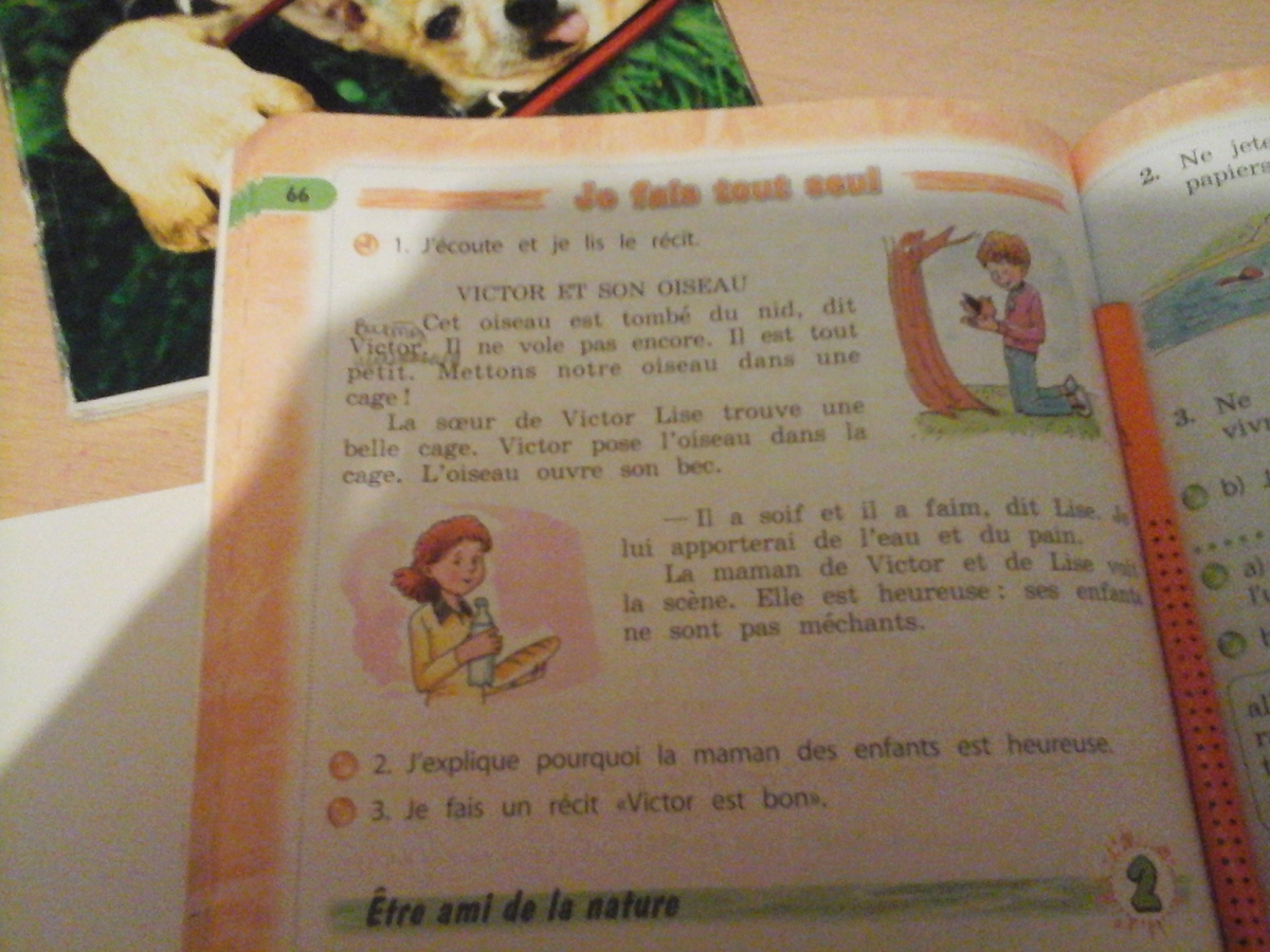 ВИКТОР И ПТИЦА CIA Эта птица гнездо падает с Саидом еще не летают. мала. Mrettons наша клетка птицы да Radi сестра Виктора Lise красивая клетка. Виктор просит птицу в клетке. Птица открыл свой клюв. пить и есть, сказал Лизе, принести ему воды и хлеба мама Виктора и Lise ж soene. Она счастлива, ее дети не являются злом.