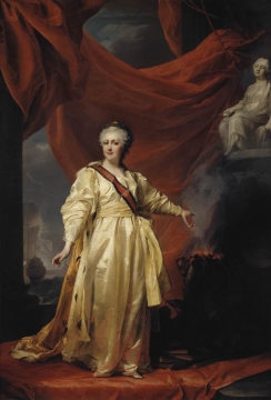 Парадный портрет Екатерины 2, созданный Левицким, можно считать исторической картиной, цель которой укреплять международный престиж России, прославлять ее внешнюю политику. Екатерина 2 была сильной императрицей и потому на картине уподоблена Афине - воинственной богине мудрости. Короткая атласная туника напоминает одежду амазонки, но к реалиям времени возвращает черно - оранжевая лента ордена святого Георгия, а также доспехи побежденных врагов, брошенных к ногам царицы. В правой руке она держит меч, увитый лавровой ветвью и вложенный в ножны. Им она указывает на завоеванные земли.