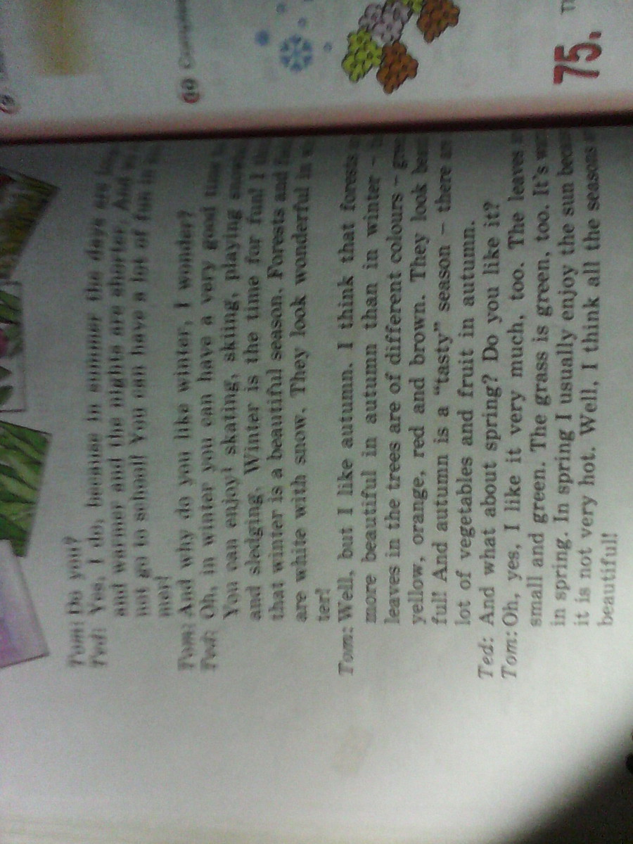 Тед: Нет, не нравиться. Я думаю это унылая пора(сезон). Листва желтеет(становиться желтой). Листья опадают с деревьев. Часто идут дожди. Осень часто холодная (холодное время года). Нет, мне не нравится осень. Но я люблю зиму и лето.