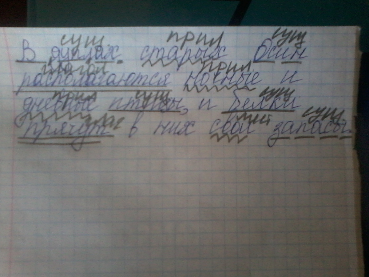 в дуплах старых осин располагаются ночные и дневные птицы, и белки прячут в них свои запасы.ПОДЧЕРКНИ члены предложения и части речи