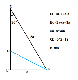 В прямоугольном треугольнике ABC угол B=90 градусов угол C=30 градусов Bc=18 см .Найдите длины отрезков на которые биссектриса AD делит катет BC/