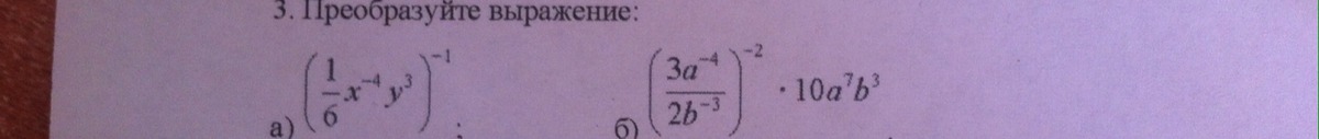( frac{3 a^{-4} }{2 b^{-3} } ) ^{-2} *10 a^{7}  b^{3} =( frac{2 a^{4} }{3 b^{3} } ) ^{2}*10 a^{7}   b^{3} = [tex] frac{40 a^{15} }{9b ^{3} }