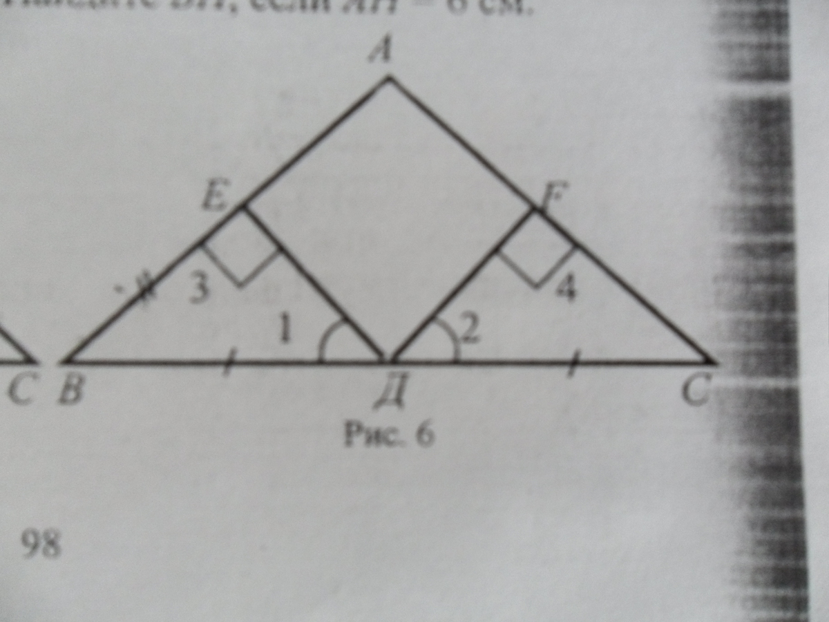 Смотри, ∠ 1=∠ 2, ∠ 3 = ∠ 4=90°, BD=DC, следовательно, треугольники равны между собой. Значит, углы B и C равны. А в равнобедренном треугольнике углы при основании равны, след. этот треугольник равнобедренный. Ну, вроде так)
