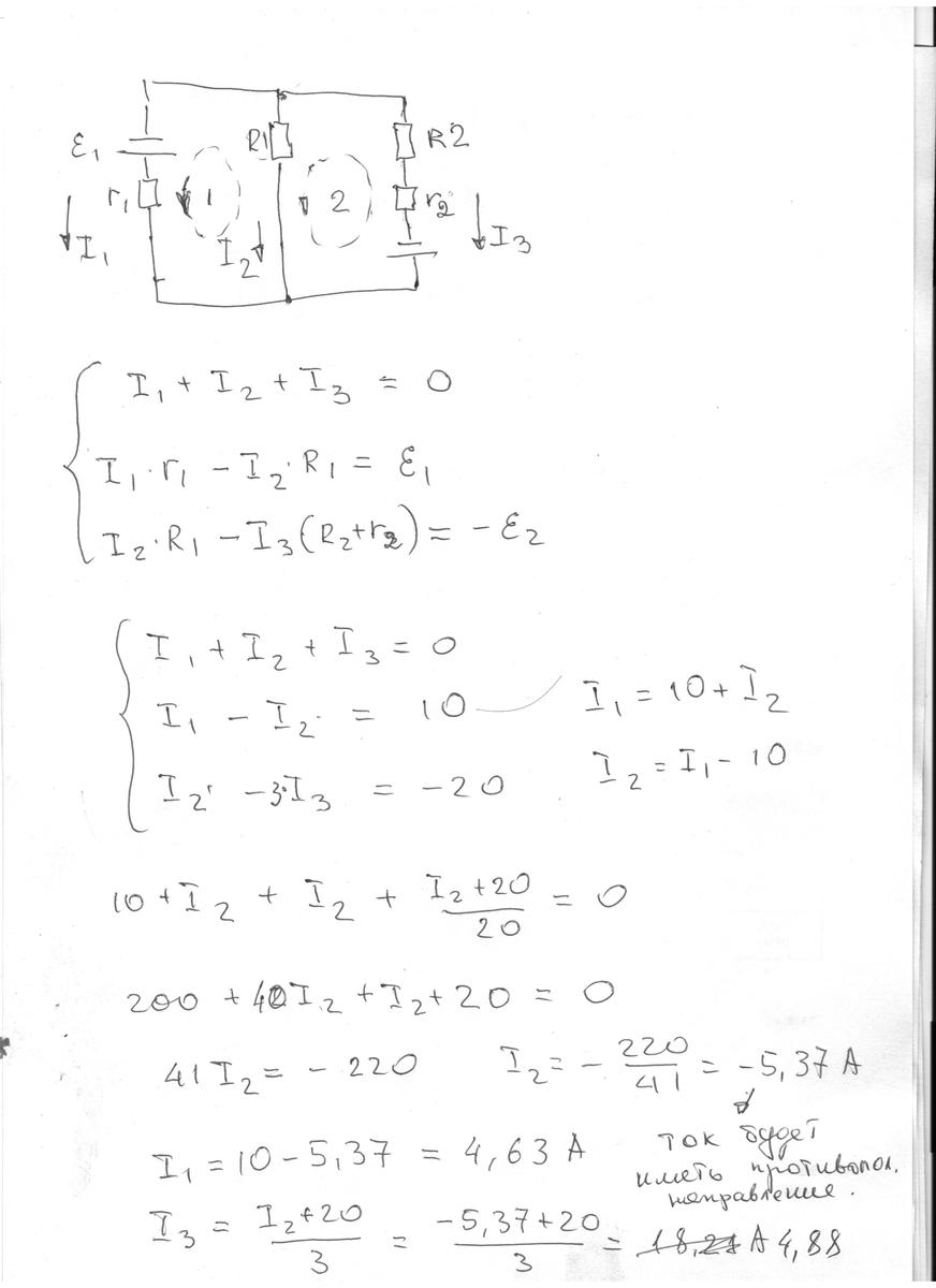Определить токи, идущие через сопротивление, если E1=10 В, Е2=20 В, R1= 1 Oм, r1=r2= 1 Ом, R2=2 Ом