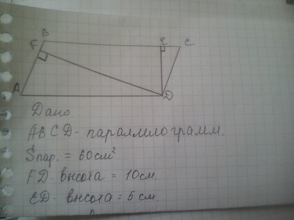 в параллелограмме АВСD высоты равны 10 и 5 см, а площадь параллелограмма равна 60 см кв. Найдите стороны параллелограмма.