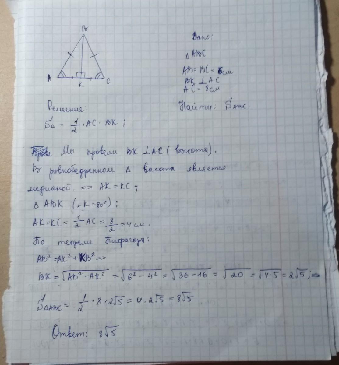 Найдите площадь равнобедренного треугольника, если известно, что основание равно 8 см, а боковая сторона - 6 см