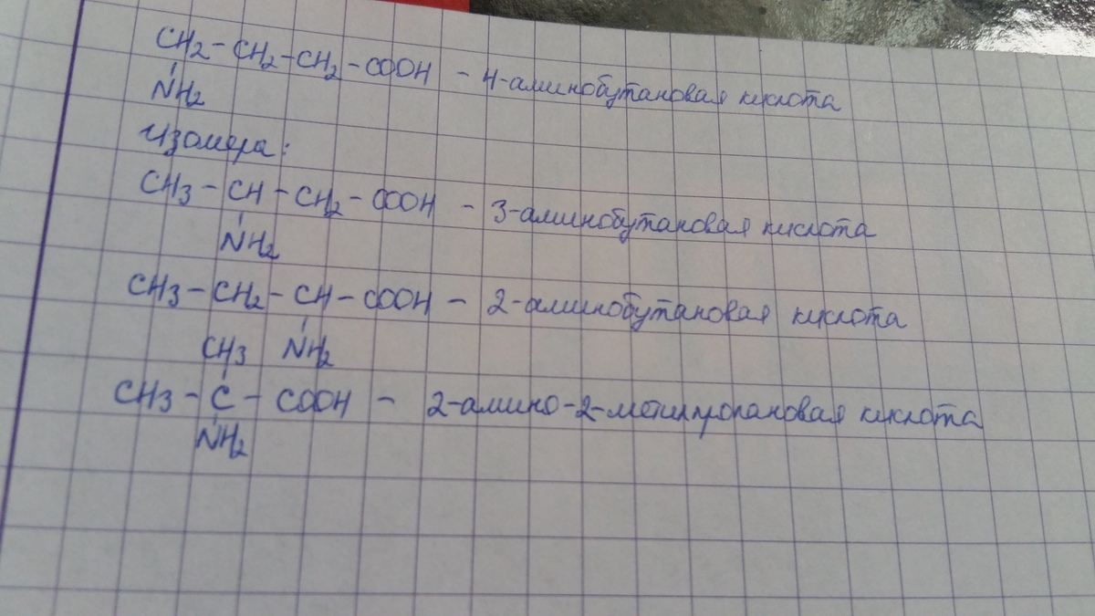 ОЧЕНЬ СРОЧНО.ПОЖАЛУЙСТА!!! Составьте структурные формулы трех изомеров и назовите их для вещества: H2N-CH2-CH2-CH2-COOH.