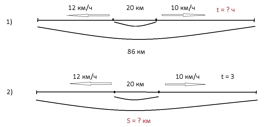 2) 12 + 10 = 22 км/ч - скорость удаления