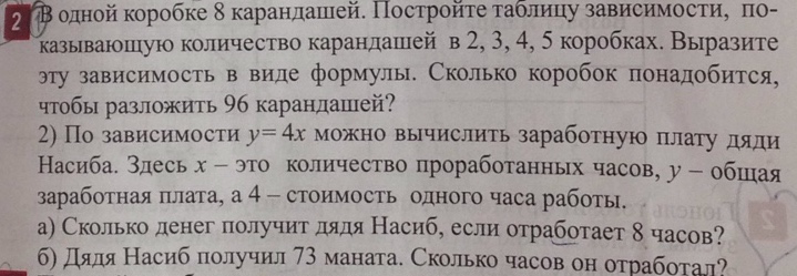 В одной коробке 8 карандашей Постройте таблицу зависимости указывающую количество карандашей в 2, 3, 4, 5 коробках Выразите эту зависимость в виде формулы Сколько коробок понадобится чтобы разложить 96 карандашей 2) По зависимости можно вычислить заработную плату дяди Здесь х — это количество проработанных часов у — общая заработная плата а 4 — стоимость одного часа работы ' 2) легат получит дядя если отрастает 8 часов Ь 7) Дядя паси получил 73 мандата Сколько часов он отработал ‘ '