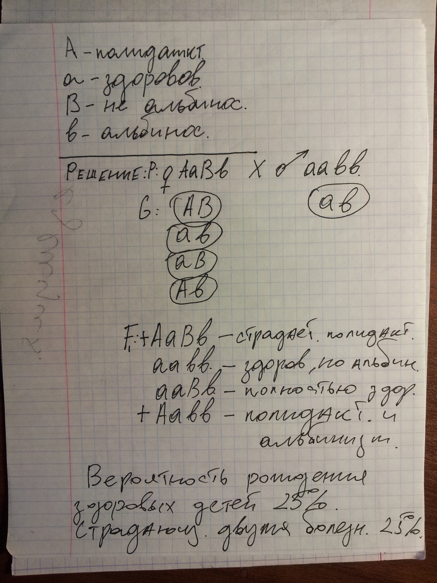 у человека полидактилия наследуется как доминантный признак,а альбинизм рецессивный признак.В семье мать страдала полидактией,а отец был альбиносом,родилась пятипалая дочь и сын,страдающий полидактией.Какова вероятность рождения в этой семье здоровых детей и детей страдающих двумя болезнями?ПООООМОООГИИИИ ТЕЕЕ ПЛИИИИЗЗЗ