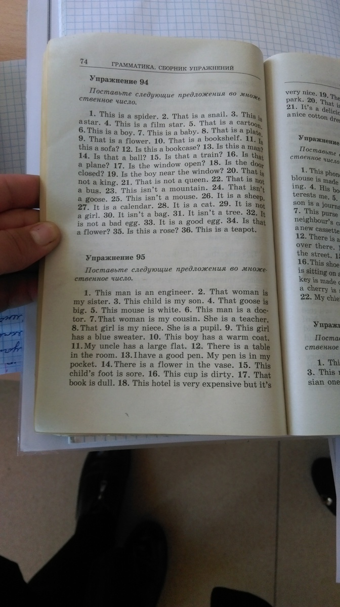 95. 1.These men are engineers. 2.Those women are my sisters. 3. These children are my sons. 4. Those geese are big. 5. These mice are white. 6. These men are doctors. 7. Those women are my cousins. They are teachers. 8. Those girls are my nieces. They are pupils. 9. These girls have blue sweaters. 10. These boys have warm coats. 11. My uncles have large flats. 12. There are some tables in the room. 13. We have good pens. Our pens are in our pockets. 14. There are some flowers in the vase. 15. These children's feet are sore. 16. These cups are dirty. 17. Those books are dull.