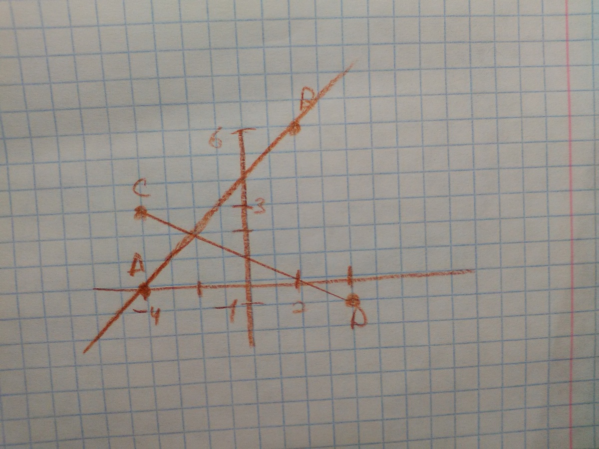 Отметьте на координатной плоскости точки A(-4;0), B(2;6), C(-4;3) D(4;-1). Проведите луч AB и отрезок CD.Найдите координаты точки пересечения луча AB и отрезка CD