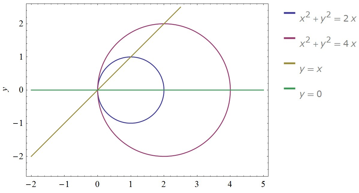 x^2 + y^2 = 2x, x^2 + y^2 = 4x, y = x, y = 0 .