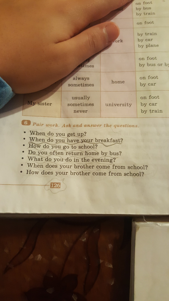 He comes by bus(Последние два предложения только если у тебя есть брат)