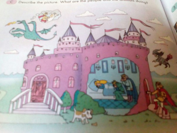 This picture shows the Sleeping Beauty.She sleeps in a big Royal castle.Over her bent her parents:the king and Queen.Somewhere in the sky above the castle, flying dragon,guarding the quarters of Sleeping Beauty.