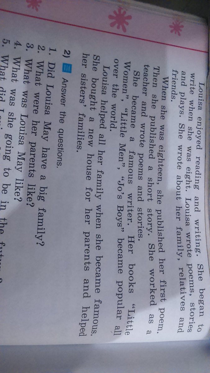 Она стала знаменитым писателем. Её книги "Маленькие женщины", "Маленькие люди" и "Мальчики Джо" стали популярные во всем мире.